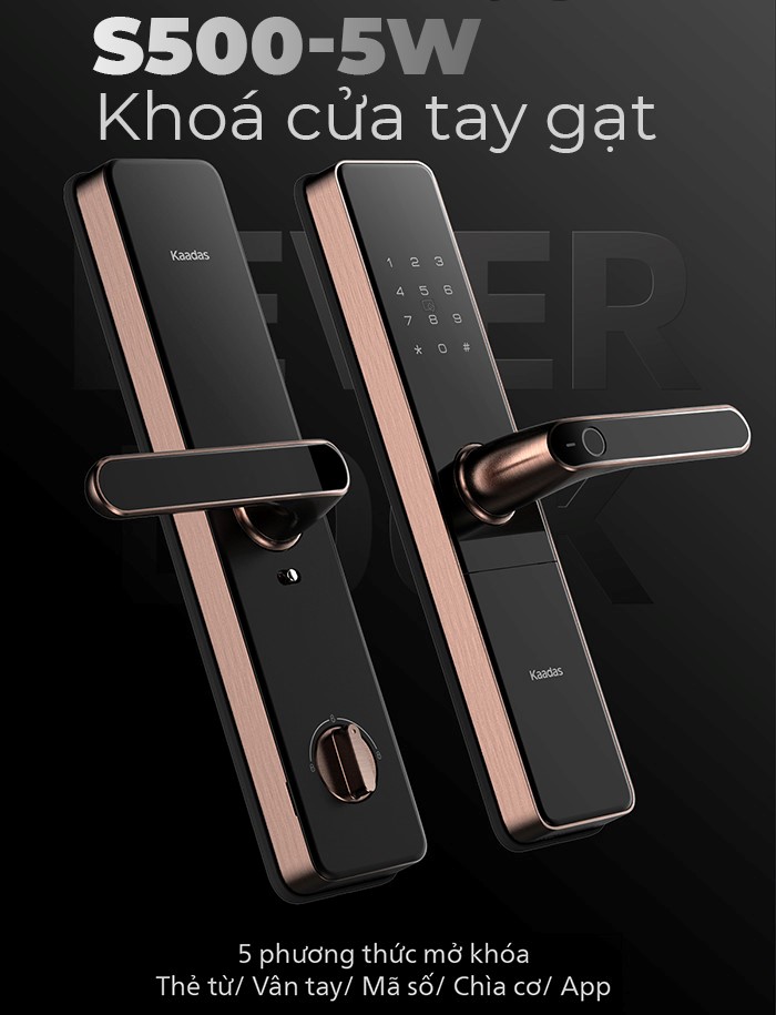 – Kaadas S500-5W có mở khóa bằng: vân tay, thẻ từ, mã số, chìa cơ, app wifi. Có thể lắp thêm phụ kiện để mở khóa qua điều khiển từ xa (remote)